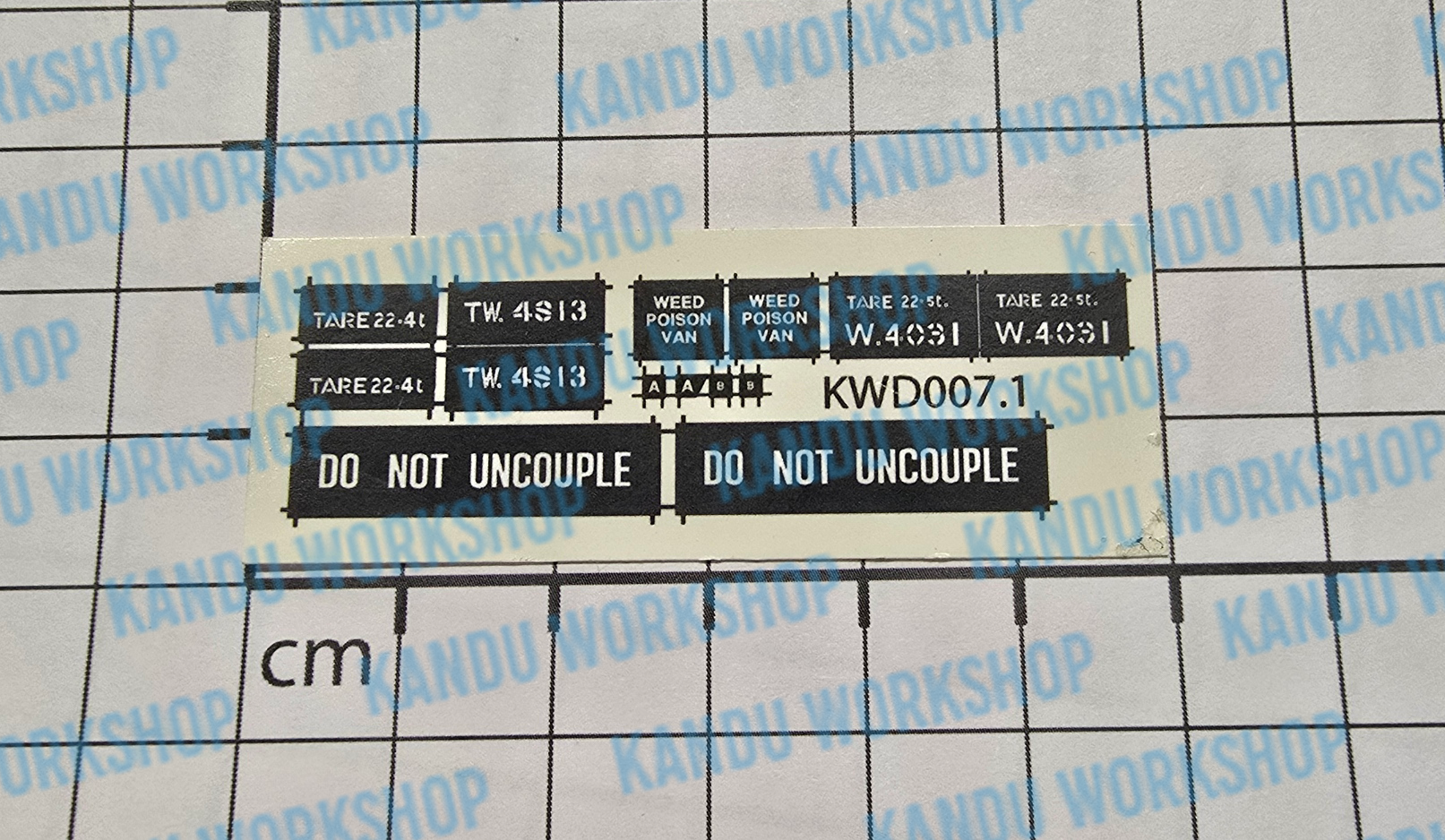 Waterslide Decals printed onto a White decal film. These are to suit the SAR weed spray/ poison train in HO Scale